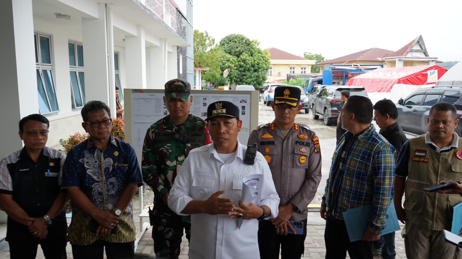 Taput – Bupati Tapanuli Utara Dr. Jonius Taripar Parsaoran Hutabarat, S.Si, M.Si bersama Dandim 0210/TU Letkol Kav Ronal Tampubolon, S.H, M.Han, Kapolres Tapanuli Utara AKBP Ernis Sitinjak, S.H, S.I.K, serta perwakilan BNPB dan Pemerintah Provinsi Sumatera Utara menyampaikan informasi terkait perkembangan penanganan bencana banjir dan tanah longsor yang melanda wilayah Tapanuli Utara selama 3 hari terakhir, bertempat di halaman kantor Bupati Taput, Tarutung pada Kamis, 27 November 2025.